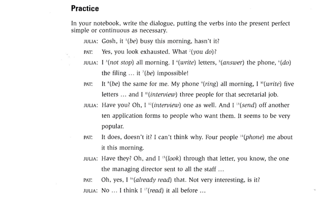 Помогу только переводом:) В записной книжке, написать диалог, поставив глаголы в настоящем совершенном простой или непрерывный по мере необходимости. ЮЛИЯ: Гоша, он (быть) занят сегодня утром, не так ли? ПАО Да, вы смотрите исчерпаны. Что ты делаешь)? ЮЛИЯ: Я '(не остановить) все утро. Я (записи) письма, (ответ) телефон ", (сделать) подачу это (BE) невозможно PNT:. Это (будет) то же самое для меня Мой телефон (кольцо) все утро, я (запись) пять букв и Я "(интервью) три человека для этой секретарской работы. ЮЛИЯ: Вы? О, мне очень (интервью) один, а также. . И я "(отправить) от еще десять заявок на людей, которые хотят их Кажется, очень популярны номинальной:. Он делает, не так ли я не могу понять, почему Четыре человека телефон) мне об этом сегодня утром?. . ЮЛИЯ:. Были ли они да, и я '(вид) через эту букву, вы знаете, управляющий директор отправлено всем сотрудникам ... PAT о, да, я (уже прочтенных), который не очень интересно, это ? ЮЛИЯ: Нет Я думаю, что (чтение) все это, прежде чем