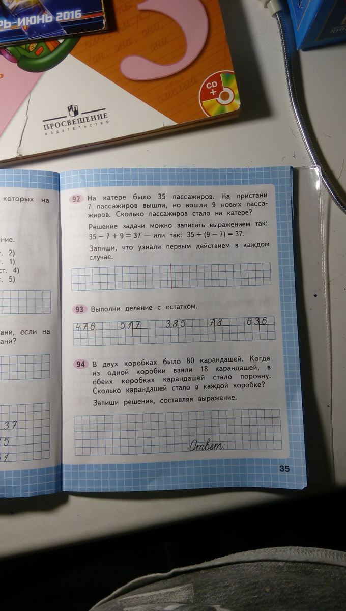 92. 1. 35-7 = 28 сколько пассажиров осталось на катере после выхода 7 пассажиров