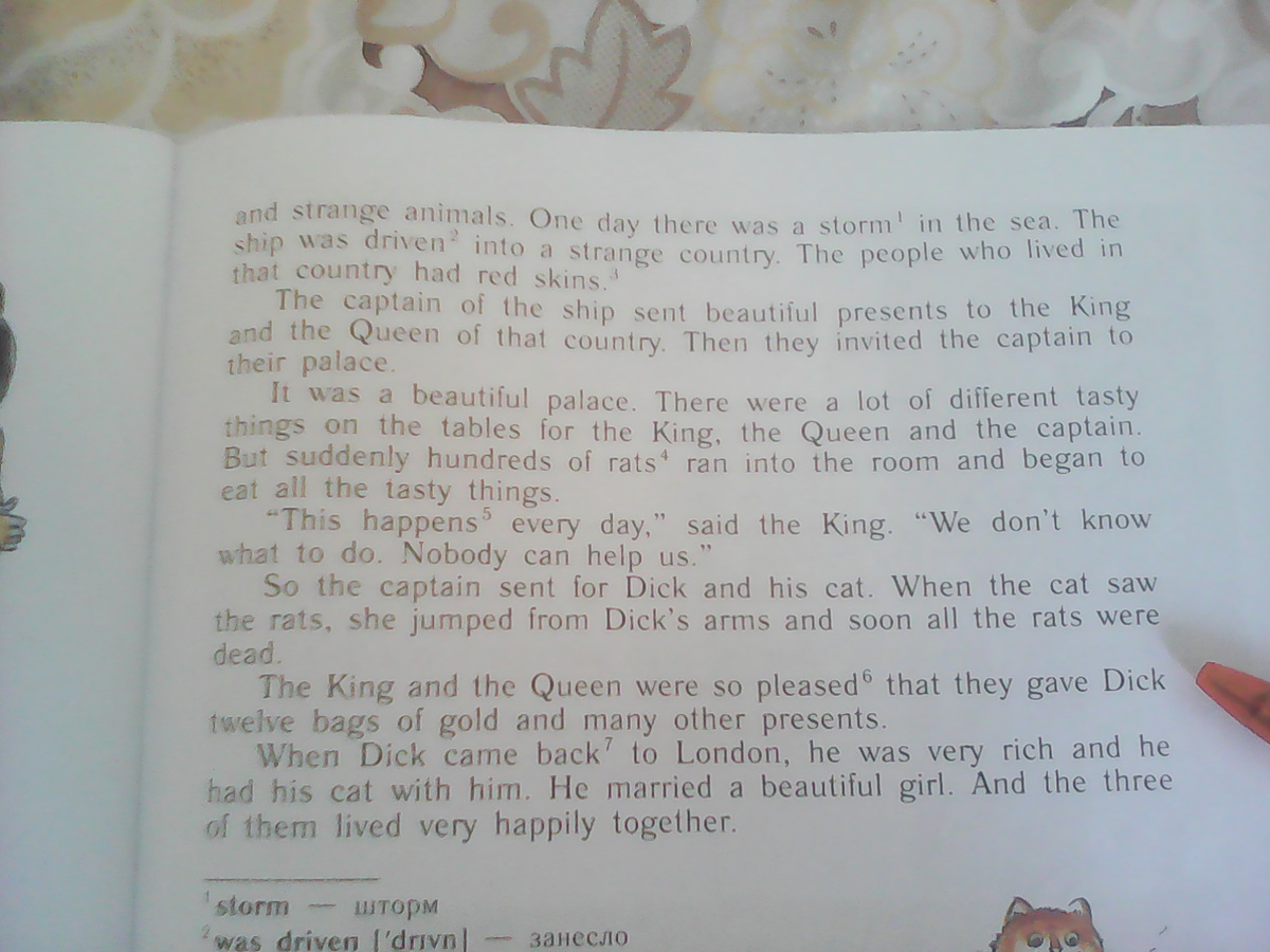 и странные животные, один был в море. На следующий день там шторм корабль был вызван Ито странная страна Люди, которые жили в стране были красные шкуры. Капитан корабля послал прекрасные подарки королю и королеве этой страны Тогда они пригласили капитана их дворец Это был прекрасный дворец. Были много разных вкусных вещей на столах для короля. Королева и капитана Но вдруг сотни крыс вбежал в комнату и начал есть все вкусные вещи. "Это происходит день." Король сказал: "Мы не знаем, что делать. Никто не может помочь нам Так капитан послал за Дика и его кота. Когда кошка видела крыс, она прыгнула из рук Дика и вскоре все крысы были мертвы Король и Queen были настолько рады ", что они дали Дика двенадцать мешков золота и многих других подарков. Когда Дик вернулся в Лондон, он был очень богат, и у него был кот с ним. Он женился на красивой девушке. И трое из них жили очень счастливо вместе. шторм uTopM был изгнан я rivn aanecuno