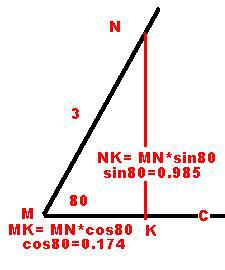 постройте угол NMC=80 градусов на стороне MC отрезок MN=3см найдите расстояние от N до стороны MC