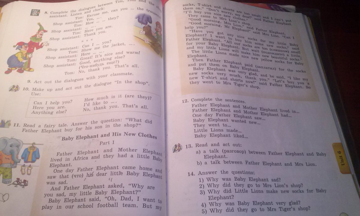 Маленький слонёнок был очень довольный и он сказал:" мне очень нравятся мои новые носки,спасибо тебе" "давай купим тебе новую футболку и шорты сейчас!"-сказал папа слон. Поэтому они отправились в магазин тигра.