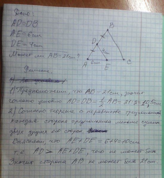 На сторонах АВ и АС треугольника АВС обозначено точки D и Е, при чем точка D - середина АВ. АЕ=6см, DE=4см. Может ли длина стороны АВ=21см?