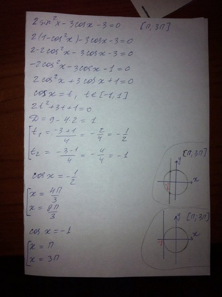 1) 2sin^2х - 3cosx - 3 = 0 [п; 3п]