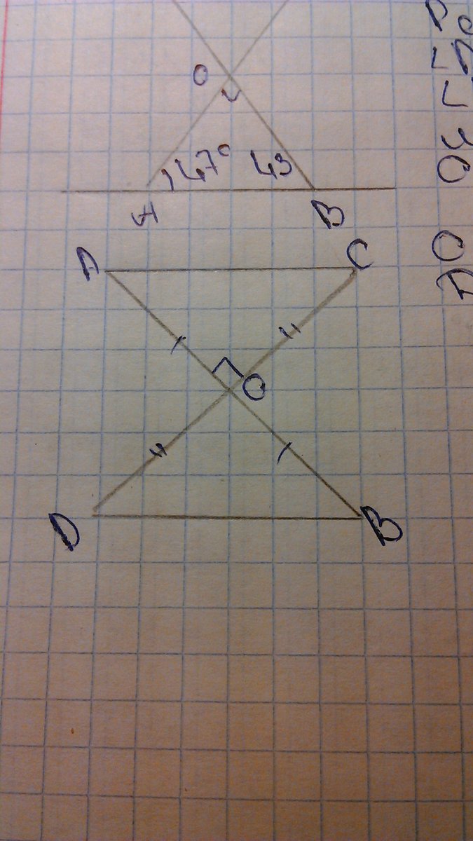 Рассмотрим два треугольника AOC и DOB - они прямоугольные (∠AOC=90, а они с углом DOB вертикальные, тогда, ∠AOC=∠DOB=90)