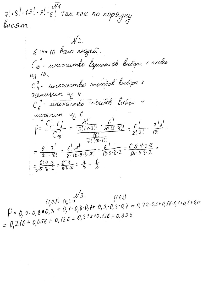 2. В цеху працюють шість чоловіків і чотири жінки. По табельним номерам випадково відібрали сім робітників. Яка ймовірність того, що серед відібраних виявляться три жінки?