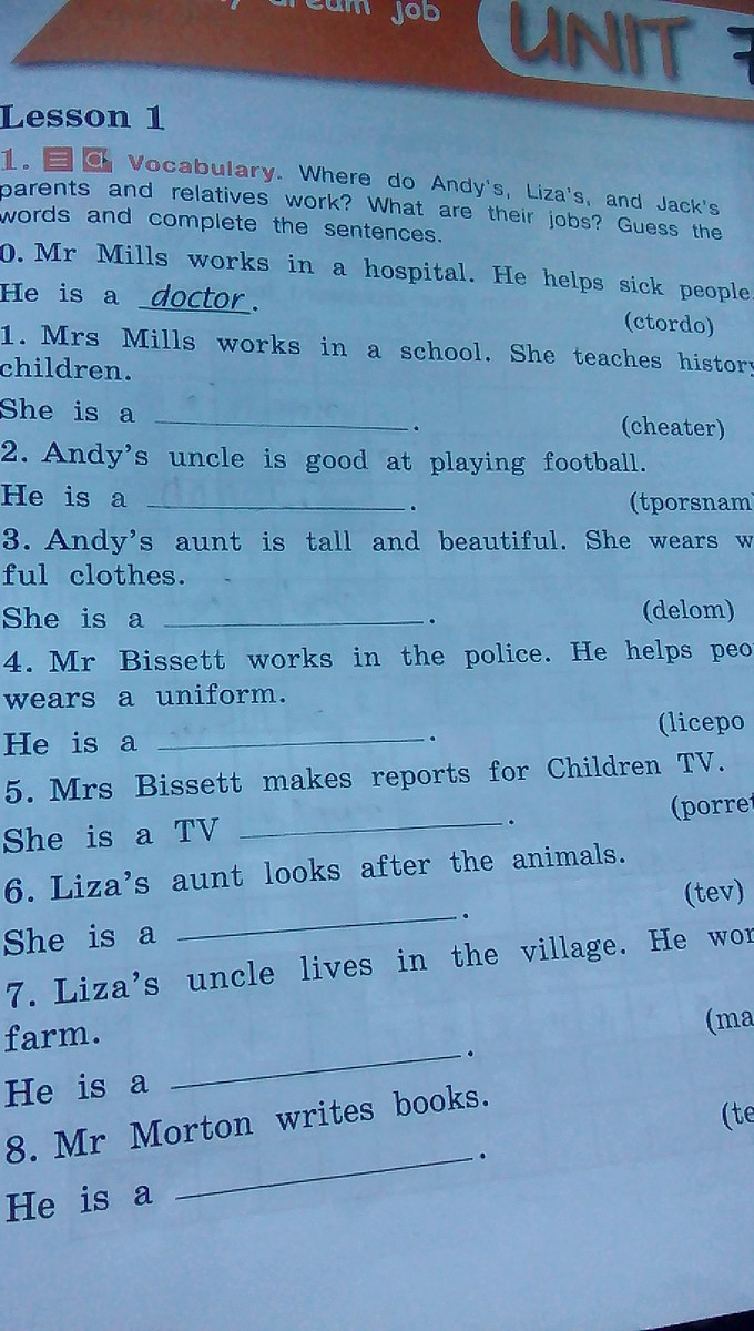 1. teacher 2. sportsman 3. model 4 police officer 5. reporter 6. vet 7. farmer 8. writer