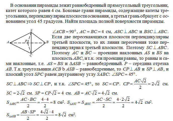 В основании пирамиды лежит равнобедренный прямоугольный треугольник, катет которого равен 4 см. Боковые грани птрамтды , содержащие катеты треугольника, перпендикулярны плоскости основания, а третья грань образует с основанием угол 45 градусов. Найти площадь полной поверхности пирамиды.