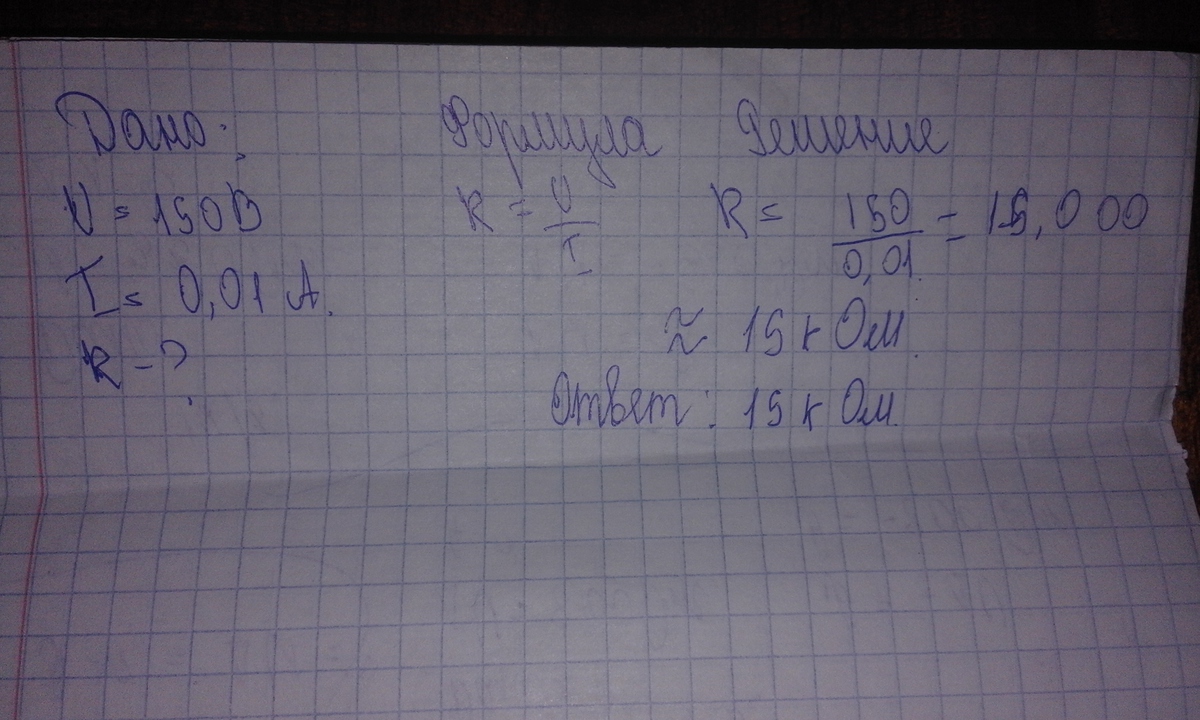 Каким сопротивлением обладает вольтметр,рассчитанный на 150В,если сила тока в нем не должна превышать 0.01А?