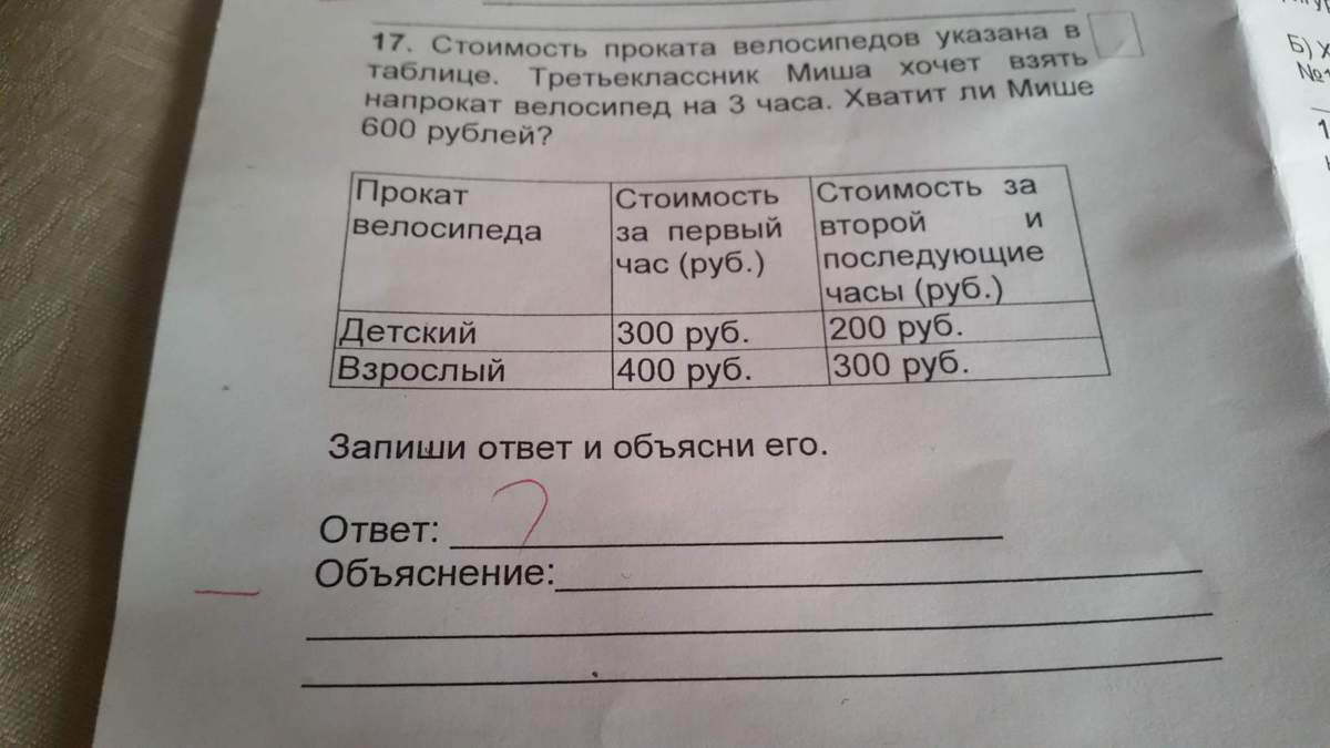 300+200+200=700 РУБ.Ответ:не хватит, т.к у него 600 руб,а 3 ч-700 руб.ЗА 1 ЧАС-300 РУБ. НО ЕМУ НУЖНО 3 ЧАСА . ПОЛУЧАЕТСЯ,200 +200=400 РУБ(РУБ)+ 2 ЧАСА
