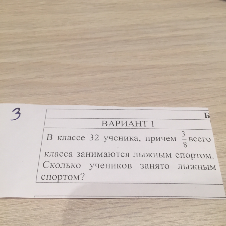 было -32у. занимаются л.с - 3/8. ?у -занимаются л. с. 1)32:8=4(у) 2)4*3=12(у) ответ : 12учеников занимаются лыжный спортом