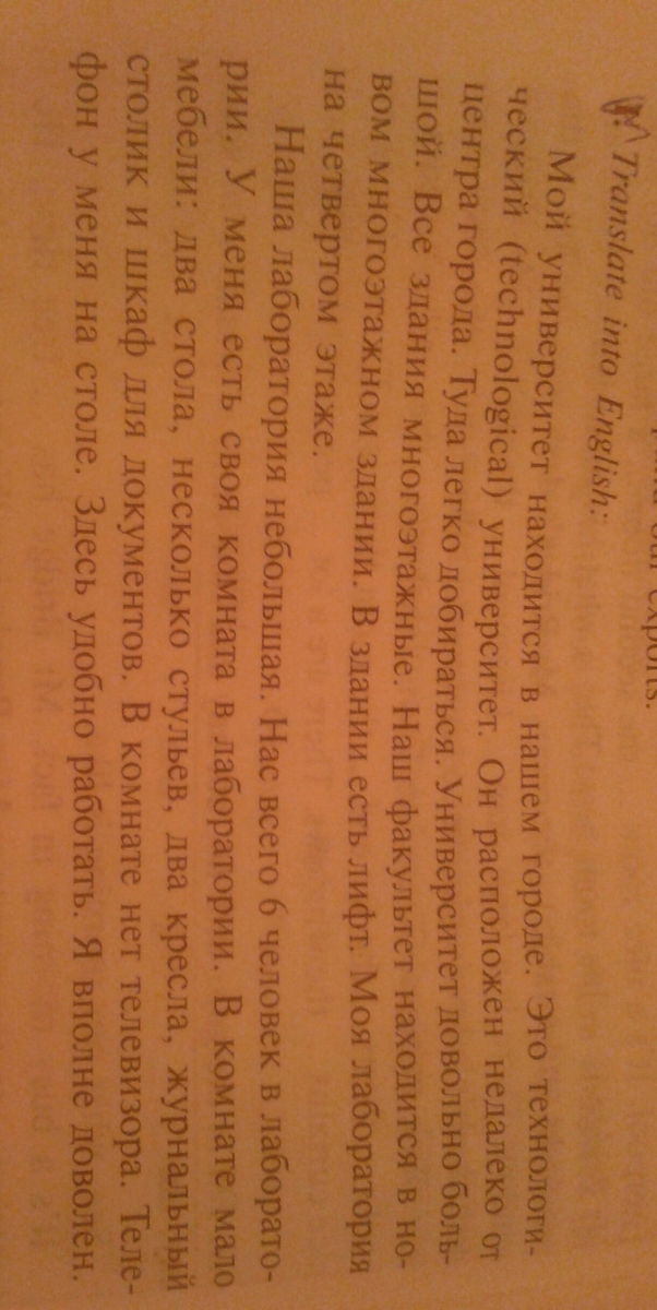 My university is located in our city is a technology cal (technological) University. he It located near the city center. There is easy to reach. University quite a pain. Scheu. All Our building lot is located in the new Faculty vom high-rise building in the laboratory. the building has a lift My fourth floor. Our laboratory is small. We were 6 people in the laboratories of all theory. I have has his own room in the lab in the room little furniture: two tables, a few chairs, two armchairs, coffee table and a cabinet for documents. The room has no TV. Tele- background on my desk. Here convenient to operate. I'm quite happy