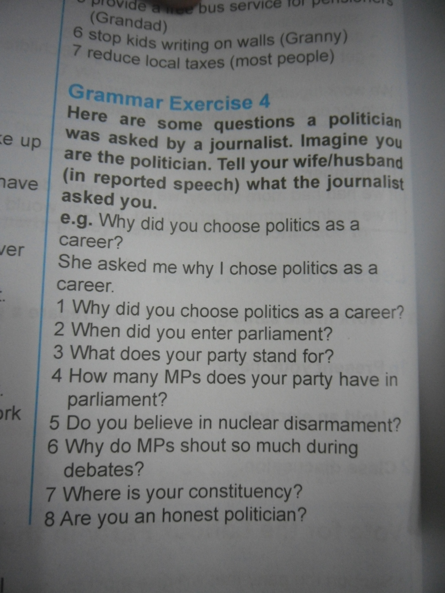 She asked me why i entered parliament.She asked me what my party stands for.She asked me how many MPs my party has in parliament.She asked me if i believe in nuclear disarmament.She asked me why MPs shouts so much during debates.She asked me where my constituency is.She asked me if i an honest politician.