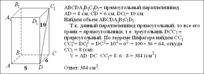 Стороны основания прямоугольного параллелепипеда равны 6 и 8см,а диагональ меньшей боковой грани равна 10см.Найдите объём параллелепипеда.