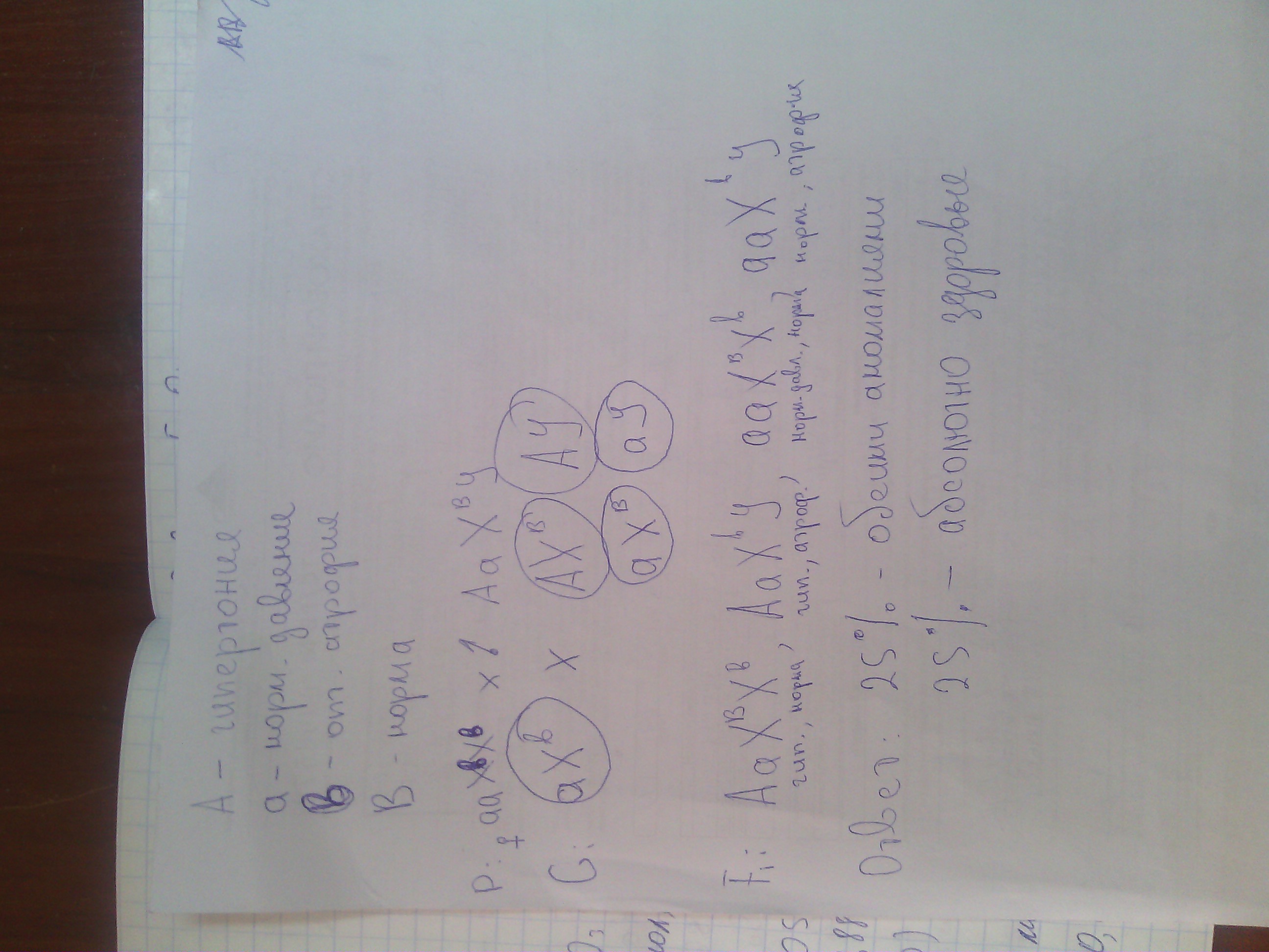 У человека аниридия (один из видов слепоты) зависит от доминантного аутосомного гена, летального в гомозиготном состоянии, а оптическая атрофия (другой вид слепоты) – от рецессивного, сцепленного с полом гена, находящегося в Х-хромосоме. Мужчина с оптической атрофией и аниридией женился на женщине с аниридией, гомозиготной по аллелю, отвечающему за отсутствие оптической атрофии. Определите возможные фенотипы потомства от этого брака.