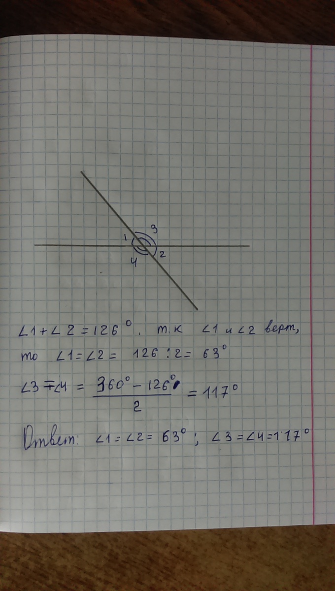 Сумма одной пары вертикальных углов, образованных при пересечении двух прямых, равна 126 градусов. Найдите градусную меру каждого угла, полученного при пересечении этих двух прямых ..........Напишите пожалуйста решение