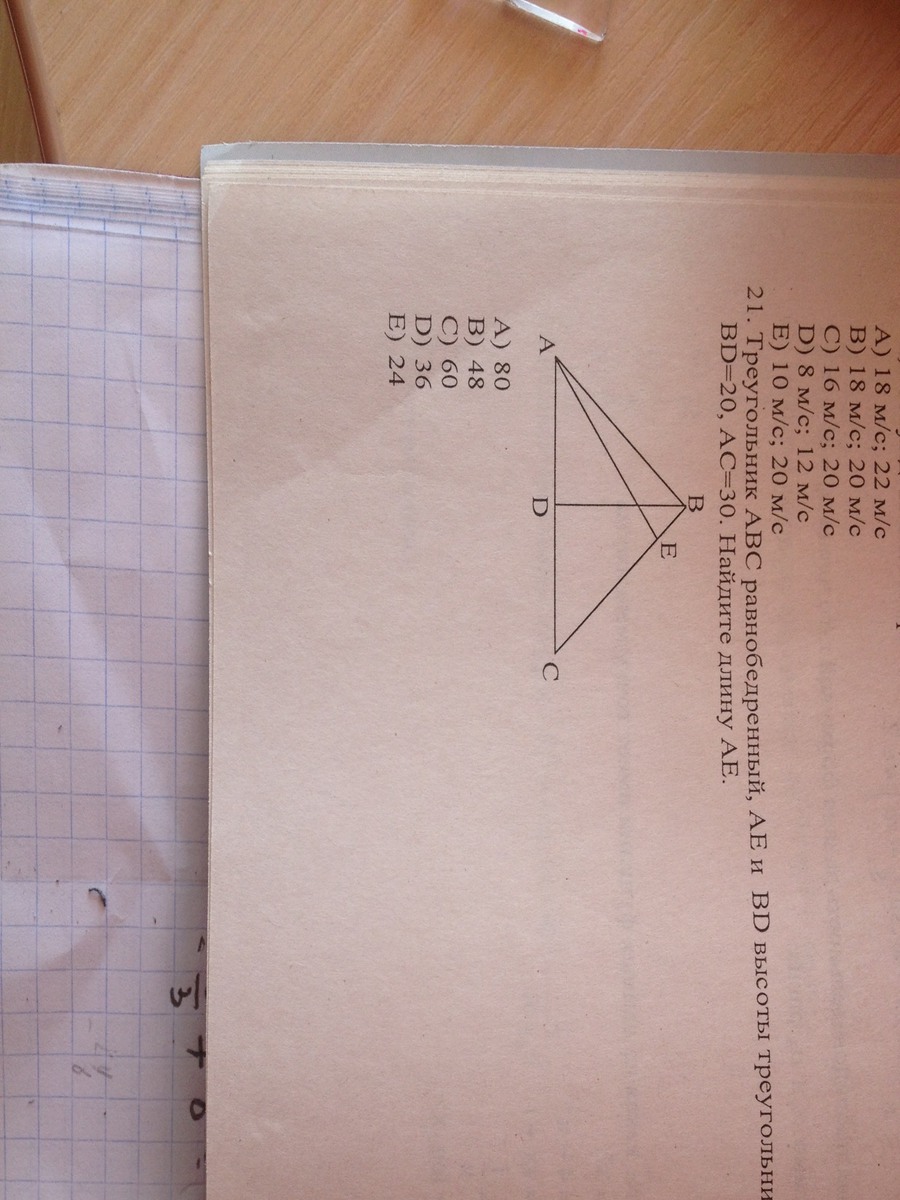 тр-к АВС равнобедренный; ВД - высота и медиана; АД=15; рассм тр-к АВД; он прямоугольный, египетский; АВ=25; S=1/2AC*BD=1/2*30*20=1/2BC*AE, 30*20=25*АЕ; (АВ=ВС по условию);АЕ=30*20/25=30*4/5=6*4=24.