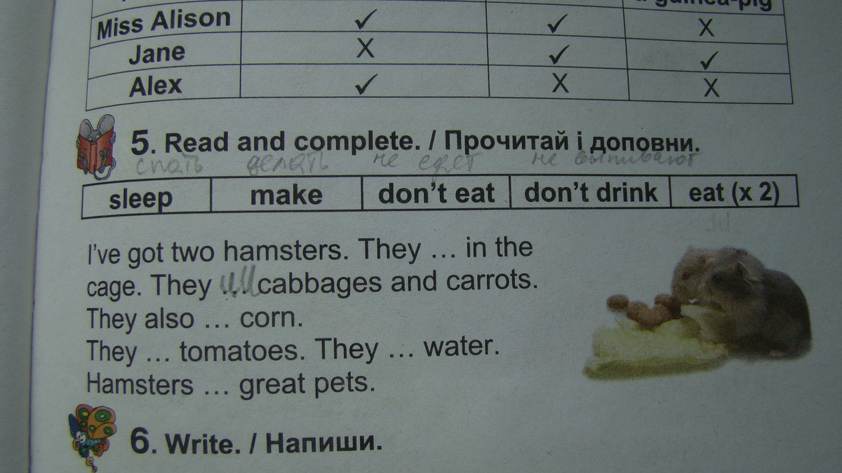 They DON'T EAT tomatoes.The DON'T DRINK water. (Хотя, тут уже тупо, может в книге опечатка,так как хомяки пьют воду и я б скорее убрала DON'T и оставить просто DRINK) И уже просто логично, MAKE в самом последнем предложение.