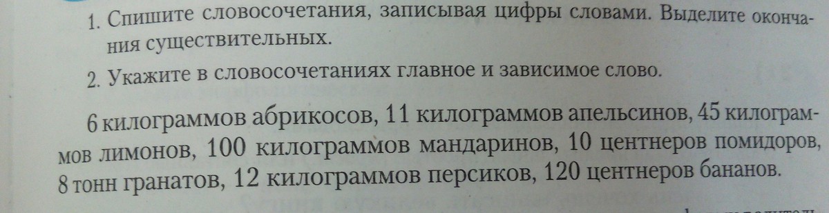 Шесть килограммов абрикосов, одиннадцать килограммов апельсинов, сорок пять килограммов лимонов, сто килограммов мандаринов, десять центнеров помидоров, восемь тонн гранатов, двенадцать килограммов персиков, сто двадцать центнеров бананов.