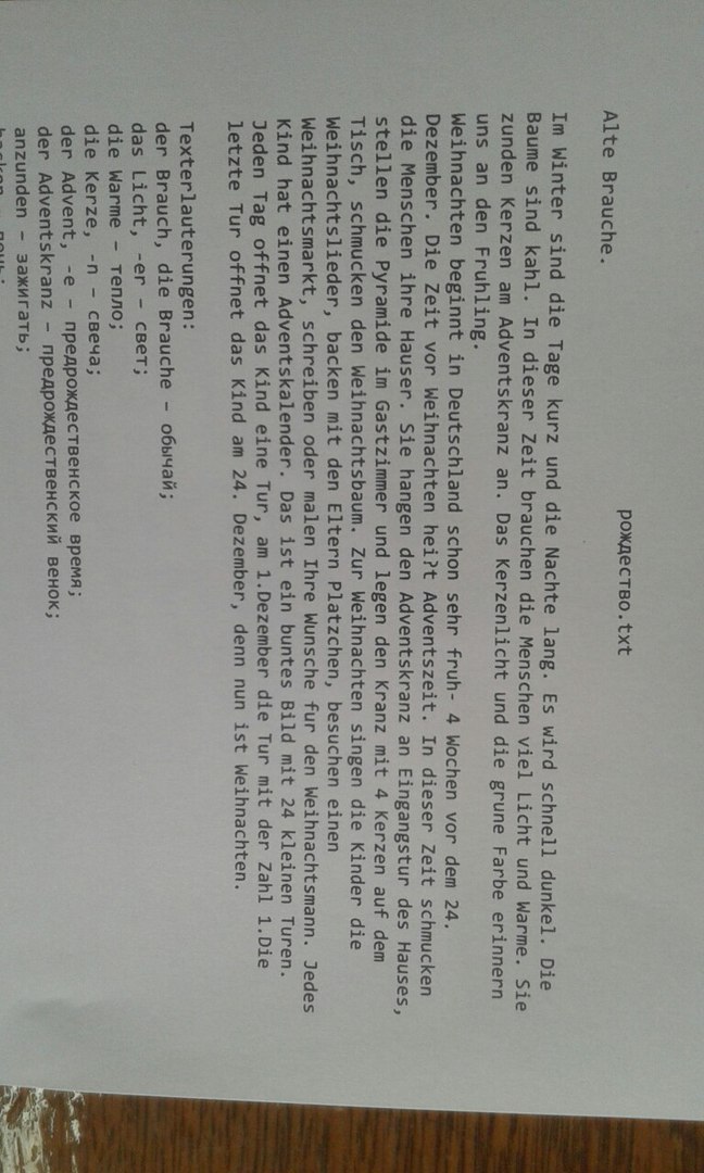 Рождество в Германии начинается довольно рано -- за 4 недели до 24 декабря. Время перед рождеством называется предрождественским временем. В это время люди украшают свои дома. Они вешают рождественские венки на входные двери домов,ставят пирамиду в гостиной и кладут венок с четырьмя свечами на стол,украшают рождественскую ель. К Рождеству дети поют рождественские песенки,пекут с родителями коврижки,ходят на рождественские рынки,пишут или рисуют свои желания для Деда Мороза. У каждого ребёнка есть свой рождественский календарь. Это пёстрая картина с 24 маленькими дверцами. Каждый день ребёнок открывает одну дверцу,первую -- первого декабря. Последнюю дверцу ребёнок открывает 24 декабря,в день Рождества.