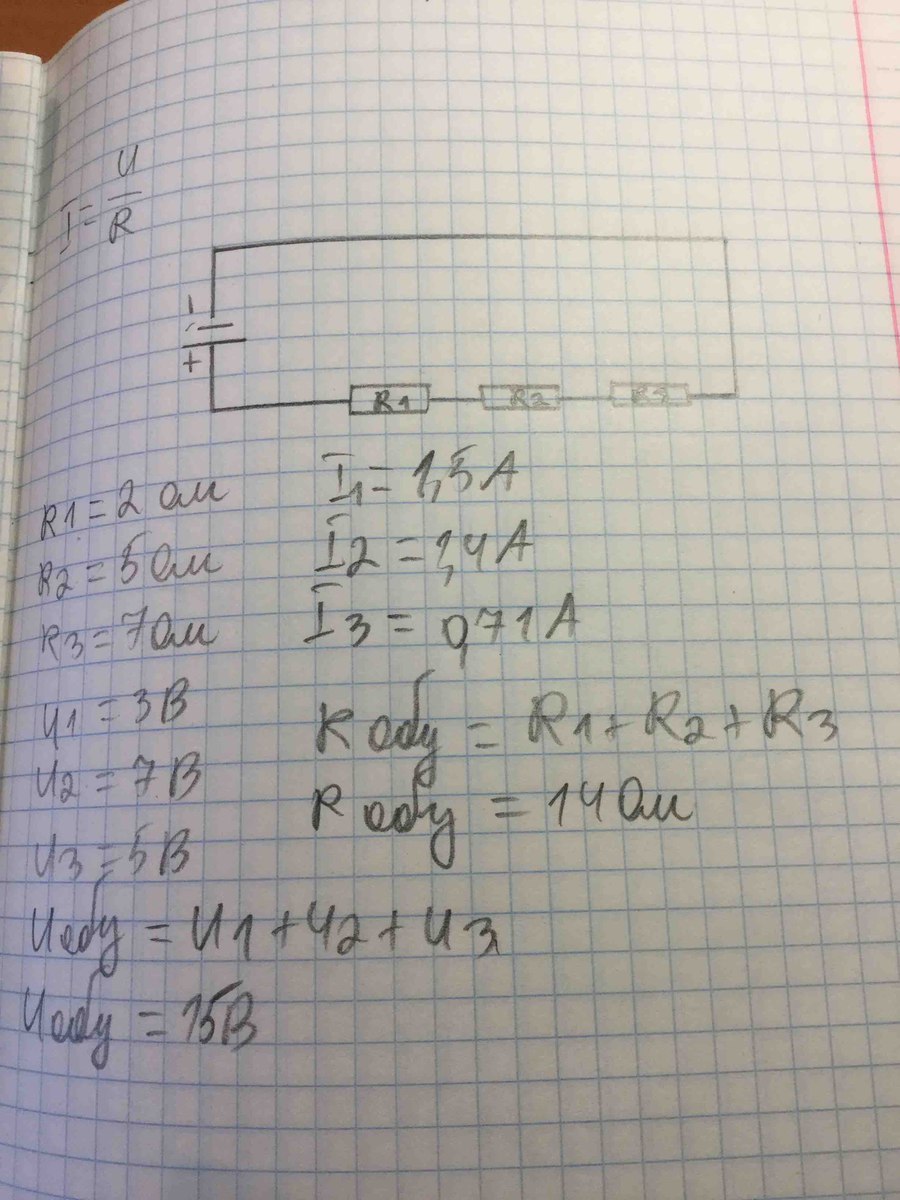 Определить силу тока, общее сопротивление и напряжение в цепи постоянного тока при последовательном сопротивлении проводников, если сопротивления на участках составляют 2 Ом, 5 Ом, 7 Ом, а напряжения соответственно равны 3В, 7В, 5В.