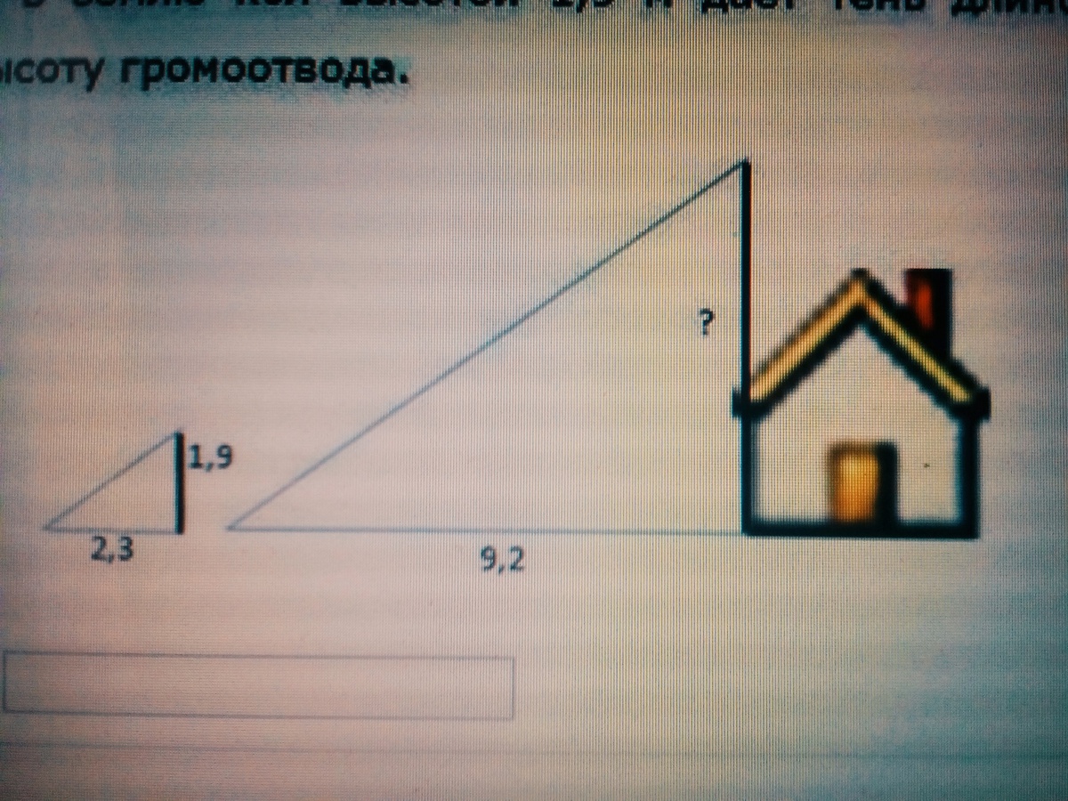 Длина тени громоотвода равна 9,2 м;в это же время вертикально воткнутый в землю кол высотой 1,9 м даёт тень длиной 2,3 м.Найдите высоту громоотвода.