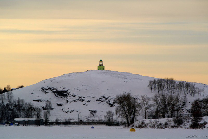 Вот пришла зима гора покрылась снегом. У подножья горы река вся заледенела. Небо стало гораздо темнее чем весной. Деревья стоят без совсем голые без листьев. На лёд вышли рыбаки чтобы рыбачить и поставили полатки.