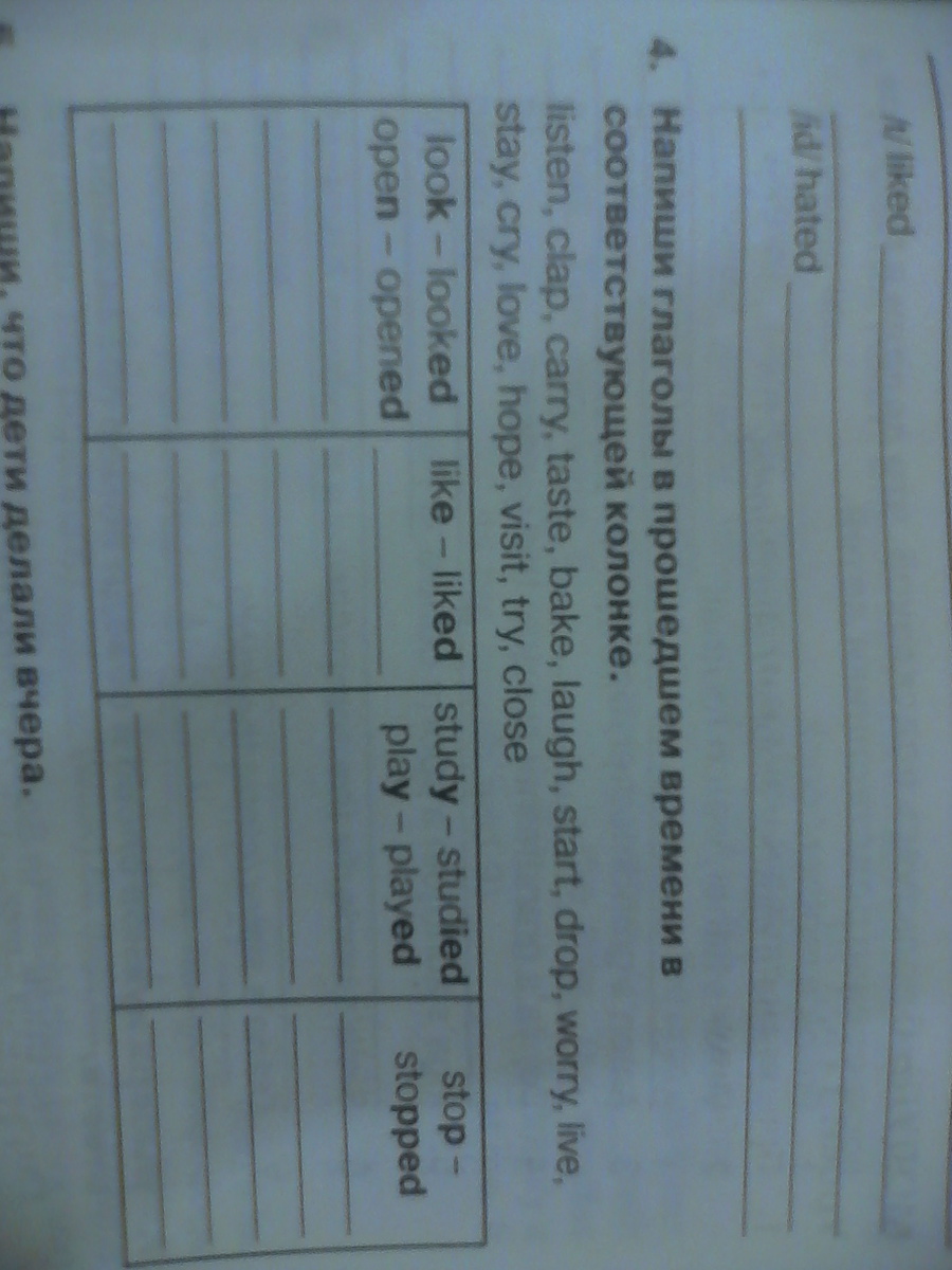 1-listened, laughed, sterted, lived, visited. 2- tasted, baked, loved, hoped, closed. 3- carried, worried, staied, cried, tried. 4- clapped, dropped