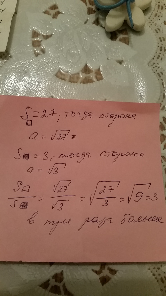 Площадь одного квадрата равна 27 см2, а площадь другого квадрата 3 см2. Во сколько раз сторона первого квадрата больше стороны второго квадрата.