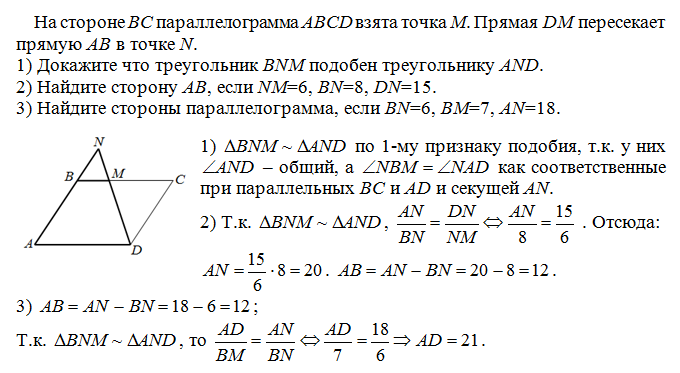 на стороне bc параллелограмма abcd abcdв взята точка m прямая dm пересекает прямую ab в точке n 1) докажите что треугольник bnm подобен треуголнику and 2) найдите сторону ab если nm=6 bn=8 dn=15 3) найдите стороны параллелограмма если bn=6 bm=7 an=18