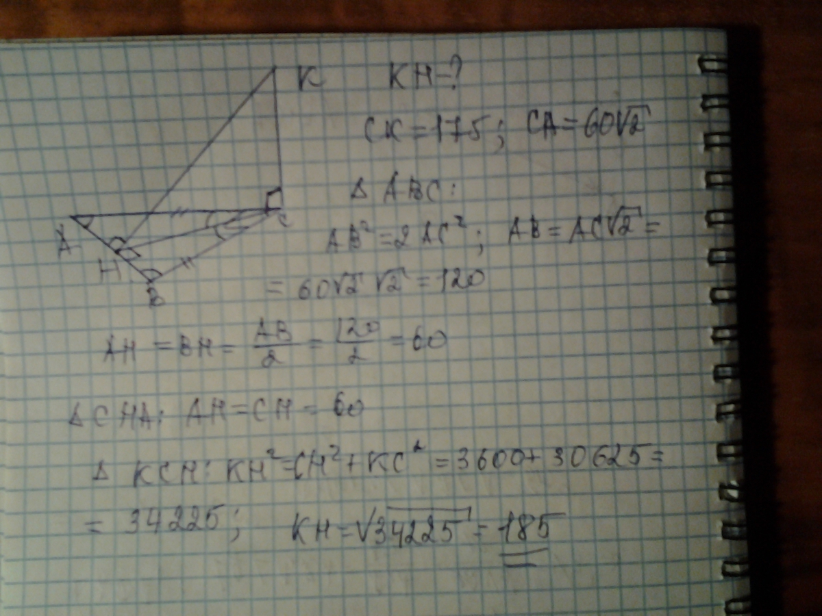 Через вершину прямого угла С равнобедренного треугольника АBС проведена прямая CK перпендикулярная плоскости этого треугольника. Найти расстояние от точки K до прямой AB, если CK = 175 см, СА = 60√2 см