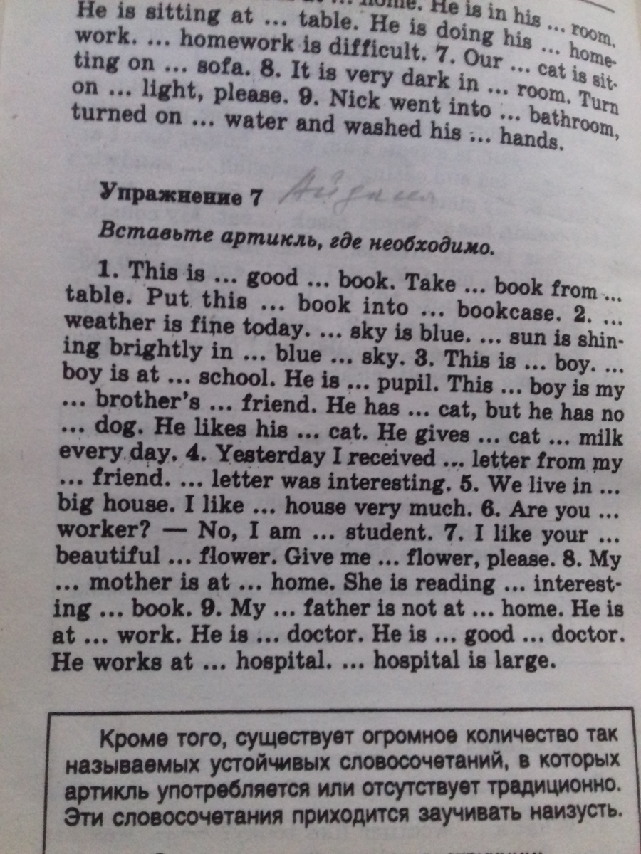 This is a good book. Take the book from the table.Put this book into the bookcase. 2. The weather is fine today. The sky is blue. The sun is shining brightly in the blue sky. 3. This is a boy. The boy is at school. He is a pupil. This boy is my brother's friend. He has a cat, but he has no dog. He likes his cat. He gives the cat milk every day. 4. Yesterday I received a letter from my friend. The letter was interesting. 5. We live in a big house. I like the house very much. 6. Are you a worker? — No, I am a student. 7. I like your beautiful flower. Give me the flower, please. 8. My mother is at home. She is reading an interesting book. 9. My father is not at home. He is at work. He is a doctor. He is a good doctor. He works at a hospital. The hospital is large.