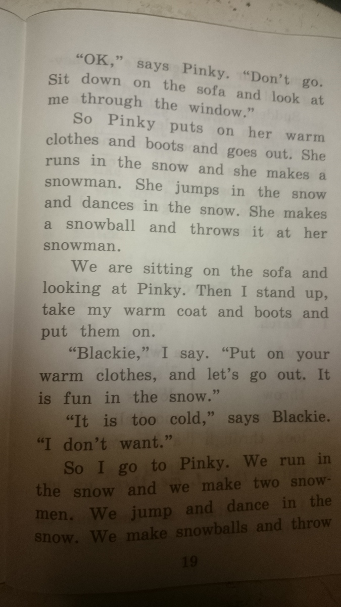 "ок "(ХОРОШО )сказала Пинки . "Не идите ".Сидите на диване и смотрите на меня через окно .Так Пинки надевает свою теплую одежду и ботинки и выходит на улицу .Она бегает в снегу , лепит снеговика .Прыгает на снегу , танцует на снегу .Она лепит снежки и кидает их в снеговика .Мы сидим на диване и смотрим на Пинки .Затем я встаю , беру моё теплое пальто и ботинки и надеваю их ."Блэки " я говорю -"Одень свои теплые вещи и пойдем выйдем . Очень весело на снегу ."Слишком холодно " говорит Блэки , я не хочу . И так я пошел (пошла ) к Пинки . Мы бегали в снегу и сделали двух снеговиков .Мы бегаем и танцуем в снегу .Мы делаем снежки и кидаем ...
