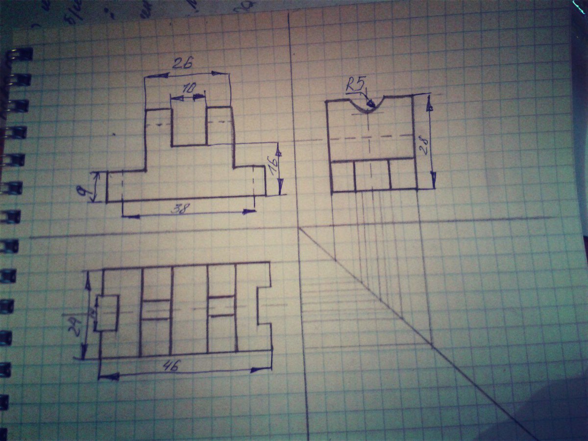 Постройте чертёж детали (3 вида) по её наглядному изображению с учётом симметрии в 2 плоскостях,нанесите размеры.Помогите пожалуйста!!!