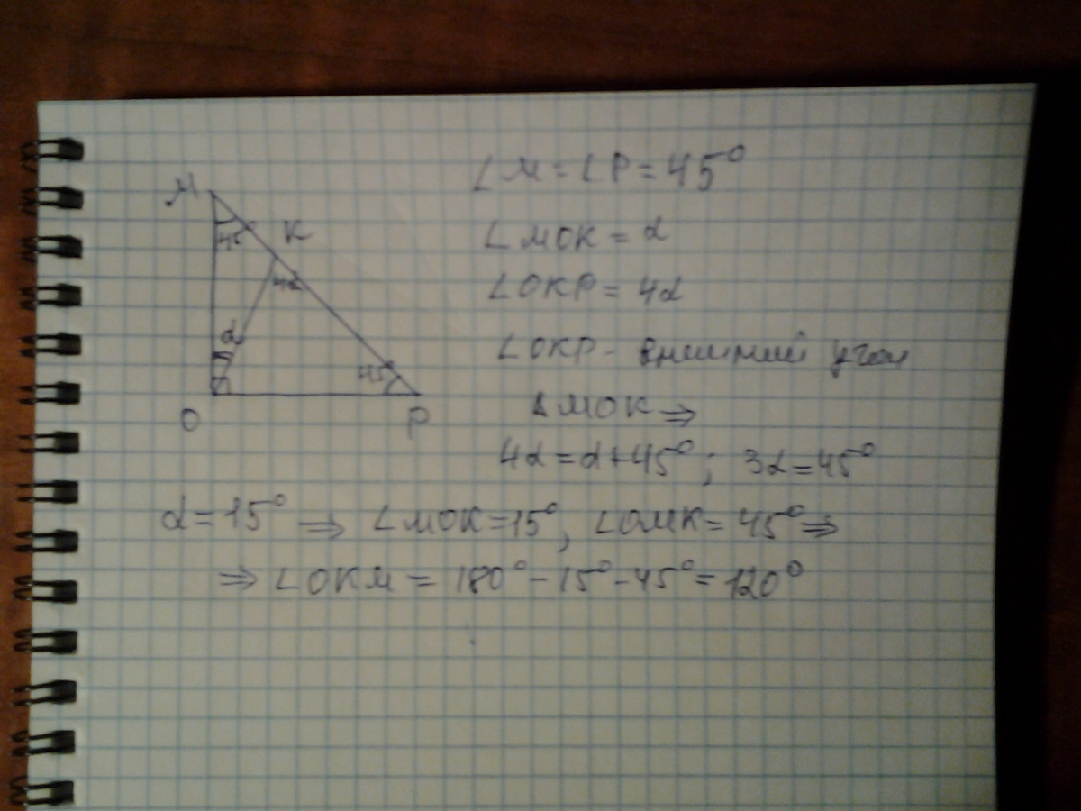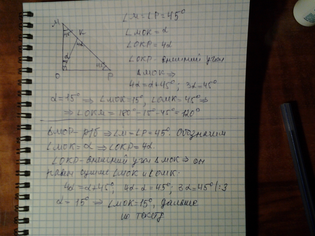 В равнобедренном прямоугольном треугольнике МОР на гипотенузе МР отмечена точка К. Известно, что угол ОКР в 4 раза больше, чем угол МОК. Найдите углы