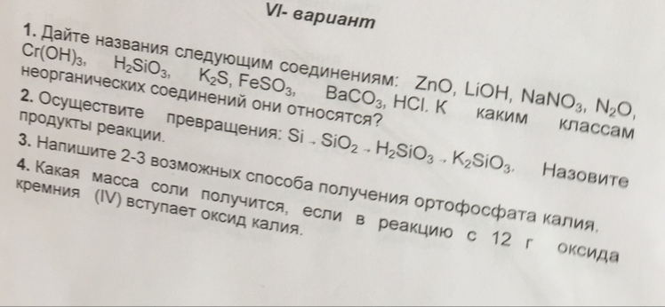 1) оксид цинка, гидроксид лития, нитрат натрия, оксид азота, гидроксид хрома, силикатная кислота, сульфид калия, сульфит железа, карбонат калия, соляная кислота.