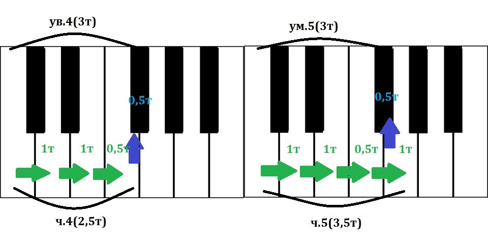 В чистой кварте 2,5 тона, в чистой квинте - 3,5, поэтому один из способов построения тритонов от звука - это построить от него чистую кварту, а затем увеличить ее на 0,5 тона (получится ув.4); построить от данного звука чистую квинту и уменьшить ее на 0,5 тона (получится ум.5); или же сразу отсчитать от звука три тона, не забывая о том, что расстояние между двумя самыми близкими друг другу клавишами равно одному полутону (см.вложение)