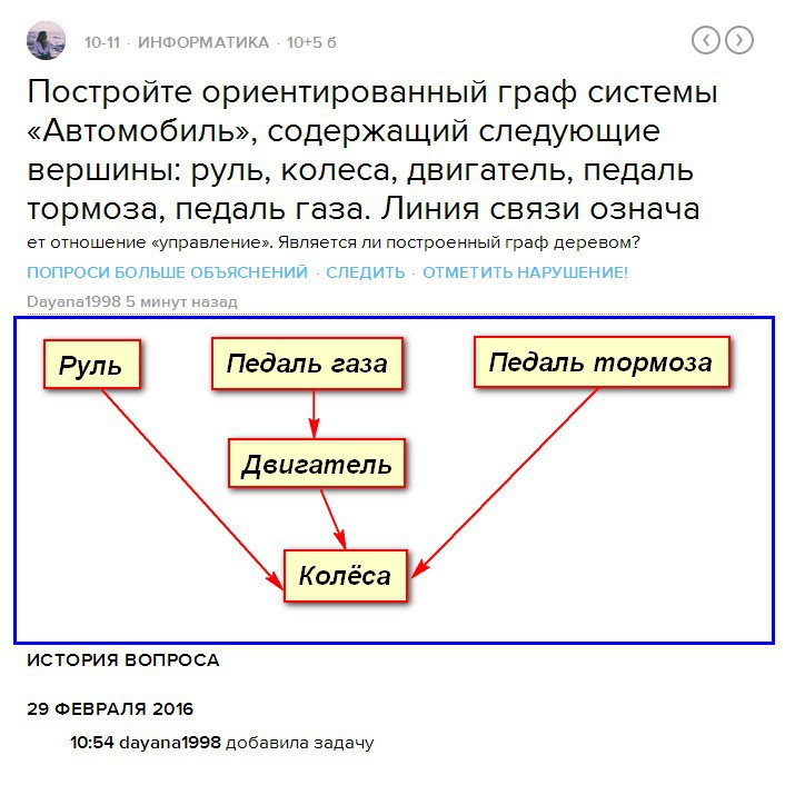 Постройте ориентированный граф системы «Автомобиль», содержащий следующие вершины: руль, колеса, двигатель, педаль тормоза, педаль газа. Линия связи означает отношение «управление». Является ли построенный граф деревом?