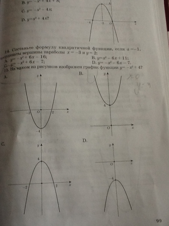 Парабола пересекает ось Х в точках "-2" и "2". Ветви параболы направлены вниз,т.к. старший коэффициент меньше нуля (а<0).