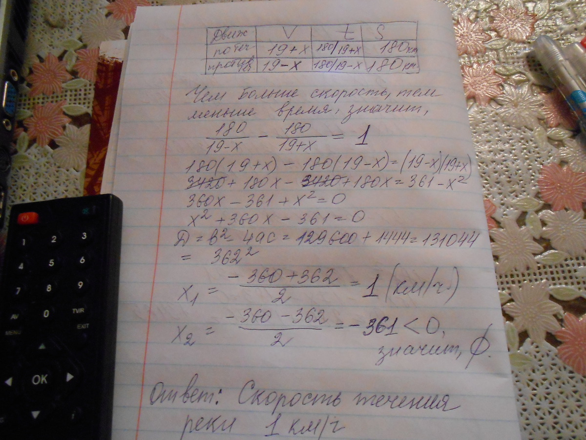 Рыбнадзорный катер патрулирует участок вдоль берега реки длинной 180 км ,против течения реки он проплывает этот участок за время, на один час большее ,чем по течению реки. Определите скорость течения реки если скорость катера в стоячей воде равна 19 км в час