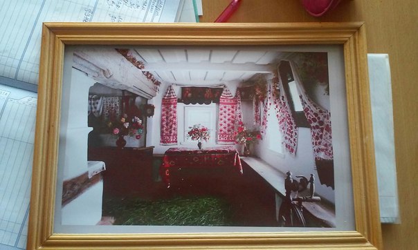 Справжня українська хата. При першому погляді на картину ми побачемо справжні українські речі. Такі як - штори з вишивкою,вишиванки що висять в кутку, так скатертину.Зелений килим, Квіти - справжні украінські. Та швацька машинка.