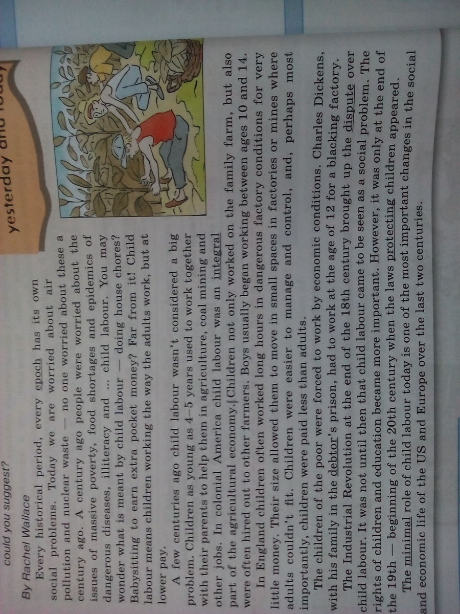 каждый исторический период,каждая эпоха имеет свои социальные проблемы . Сегодня мы беспокоимся о загрязнении воздуха и о выбрасе токсичных отходов -никто не волновался об этом столетие назад. Тогда людей волновали вопросы о бедности,голоде и эпидемиях опасных болезней,неграмотности и детском труде. Ты можешь подумать,что это значит - исполнять домашние обязанности? Сидеть с детьми за карманные деньги? Ничего подобного ! Детский труд означал работу детей как взрослых ,но меньше оплачивался. Несколько веков назад детский труд не воспринимался как большая проблема. Дети в возрасте четырех пяти лет работали вместе с родителями ,помогали им в с\х ,добыче угля и других работах. В колониальной Америке детский труд был интегральной частью с\х экономики . Дети работали не только на семейной ферме ,но и так же нанимались на других фермеров. Мальчики обычно начинали работать с 10-14 лет . В Англии дети часто работали много часов на опасных фабриках за маленькие деньги,их рост позволял им передвигаться в маленьких помещениях фабрик,куда взрослые не помещались. Дети были легки в управлении и контроле и возможно,важнее этого было то,что им платили меньше,чем взрослым . Дети бедных были вынуждены работать из-за экономических условий. Чарльз Дикинс с его семьей в тюрьме должников работал в 12 лет на черной работе. Индустриальная революция в конце 18 века спровоцировала дебаты насчет детского труда . И детский труд стал рассматриваться как социальная проблема . Права и образование детей стало более важным. В общем, это произошло только в конце 19 го века -начале 20 го века,когда появились права по защите детей. Минимальная роль детского труда сегодня один из самых важных изменений социальной и экономической жизни США и Европы за последние два столетия.
