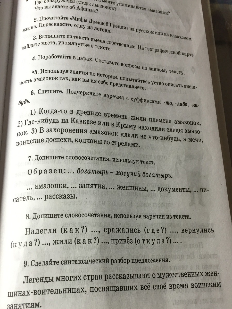 легенды-пожл.; многих-опред.; стран- дополн.; рассказывают-сказуемое.; мужественных-определ.; женщинах-воителях-дополн.; посвящавших-обстоятельство.; время-дополнение.; воинским-опред.; занятиям-дополнение