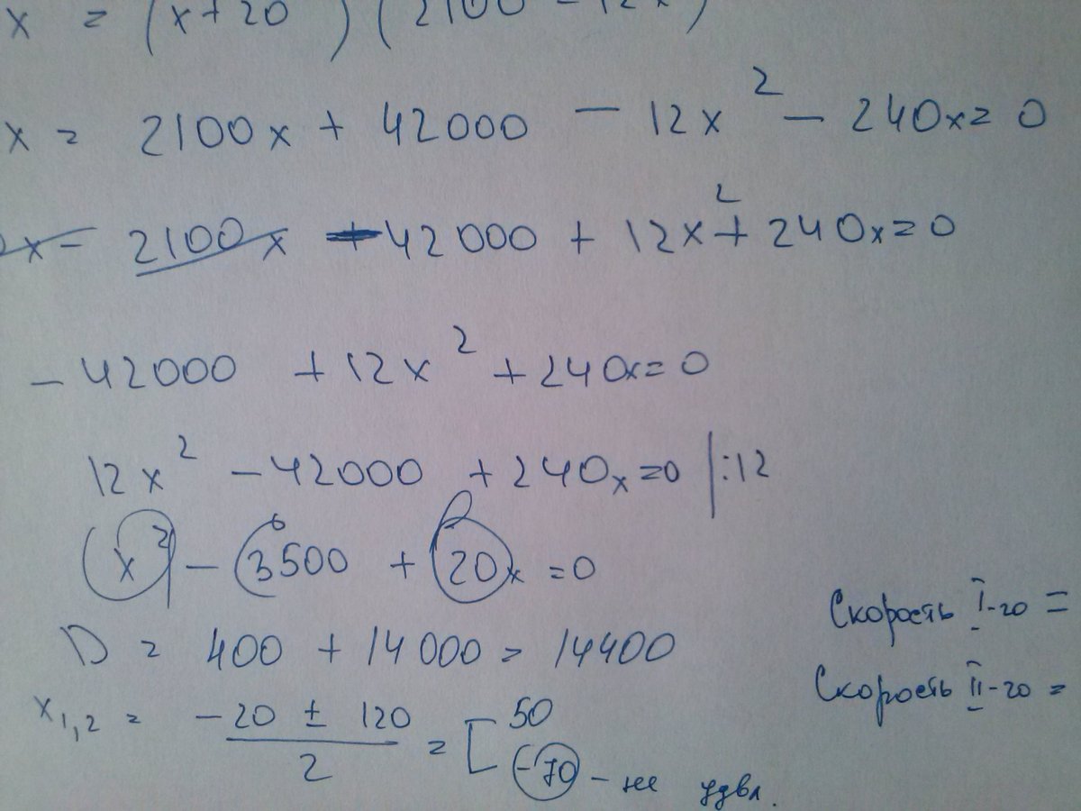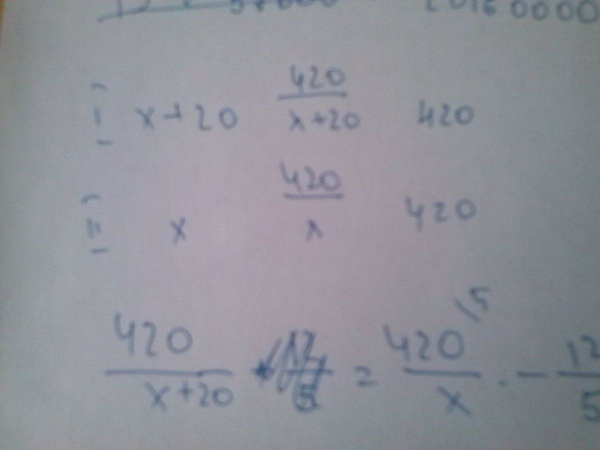 Два автомобиля выезжают одновременно из одного города в другой. Скорость первого на 20км/ч больше скорости второго и поэтому первый автомобиль приезжает на место на 2ч 24мин раньше второго. С какой скоростью шел первый автомобиль, если известно что расстояние между городами равно 420км?