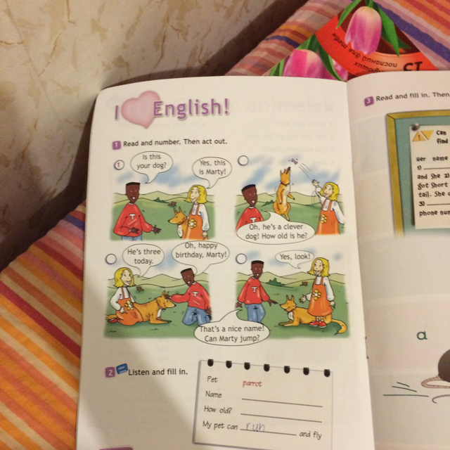 1)Это твой пёс? 2)Да,его имя Марти1)Он умный пёс,а сколько ему лет?2)Ему 3 сегодня. 1)Оу,С днём рождения Марти. 2)это хорошие имя,а он умеет прыгать?
