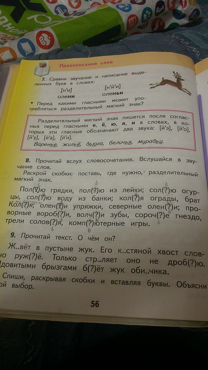 Полю грядки, полью из лейки; солю огурцы, солью́ воду из банки; колья ограды, брат Коля; оленьи упряжки, северные олени; проворные воробьи, волчьи зубы, сорочье гнездо, трели соловья, компьютерные игры.