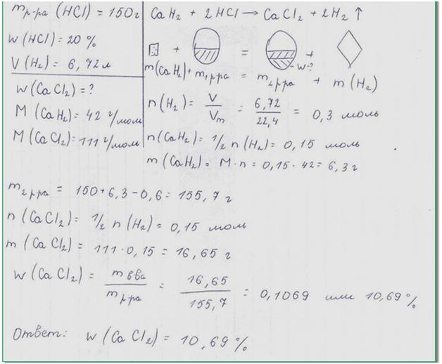 Гидрид кальция внесли в избыток раствора соляной кислоты (масса раствора кислоты 150г, массовая доля HCl 20%). При этом выделилось 6,72л (н.у.) водорода. Рассчитайте массовую долю хлорида кальция в полученном растворе.