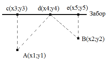 Даны две точки А и B. Из точки А брошен камень в забор, отлетев от него он попадает в точку В.