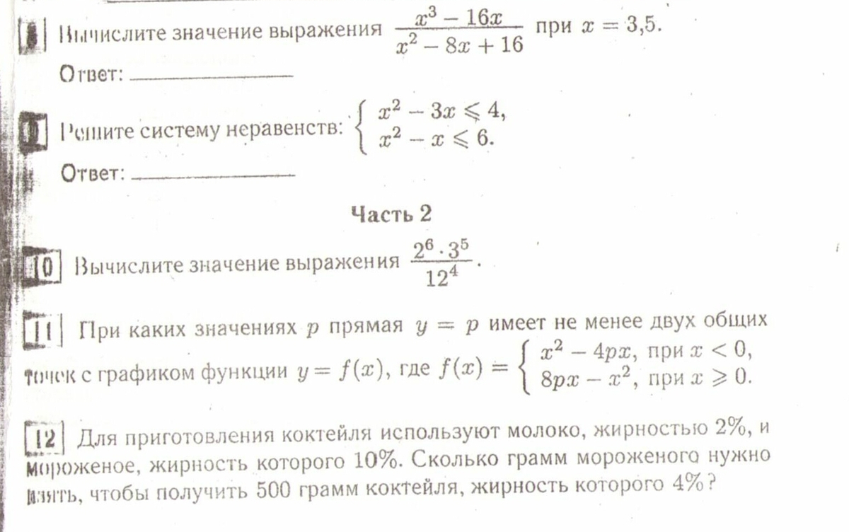 12) Пусть х грамм мороженого, т.е. 500-х грамм молока. Жира в коктейле 500г*4%=500Г*0,04=20г