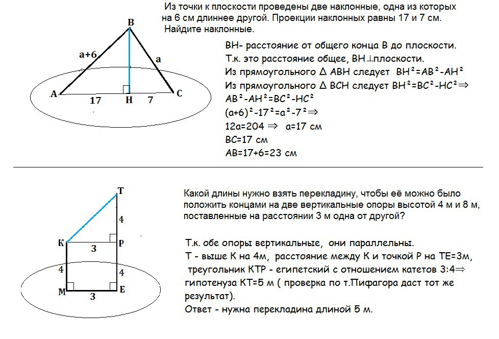 2. Из точки k плоскости проведены две наклонные, одна из которых на 6 см длиннее другой. Проекции наклонных равны 17 и 7 см. Найдите наклонные.