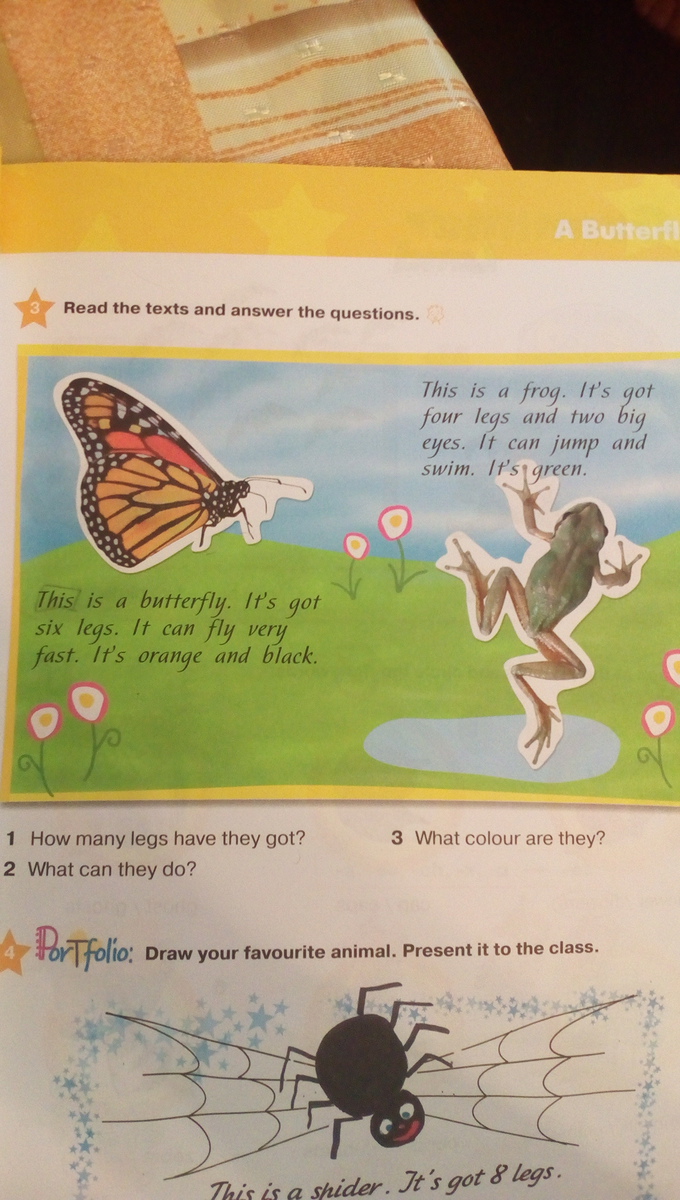 Ответы на вопросы: 1) Butterfly have six legs.(Бабочка имеет 7 ножек). Frog have four legs.(Лягушка имеет 4 лапки).2 Burrerfly can fly very fast.(Бабочка может летать очень быстро) Frog can jump and swim.(Лягушка может прыгать и плавать).3) Butterfly is orange and black colour. (Бабочка оранжевого и черного цвета).Frog is green colour.(Лягушка зелёного цвета).